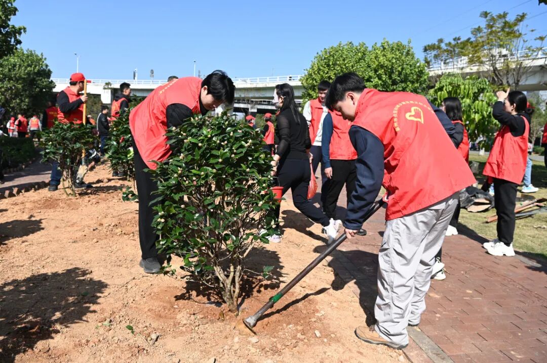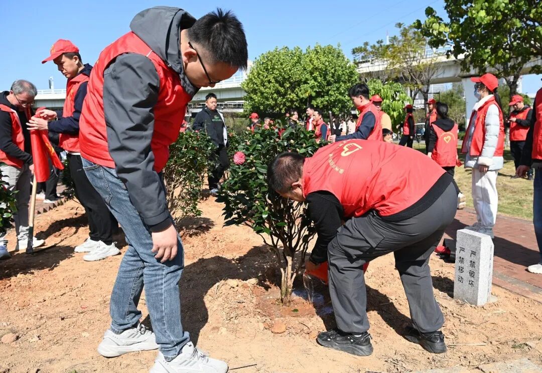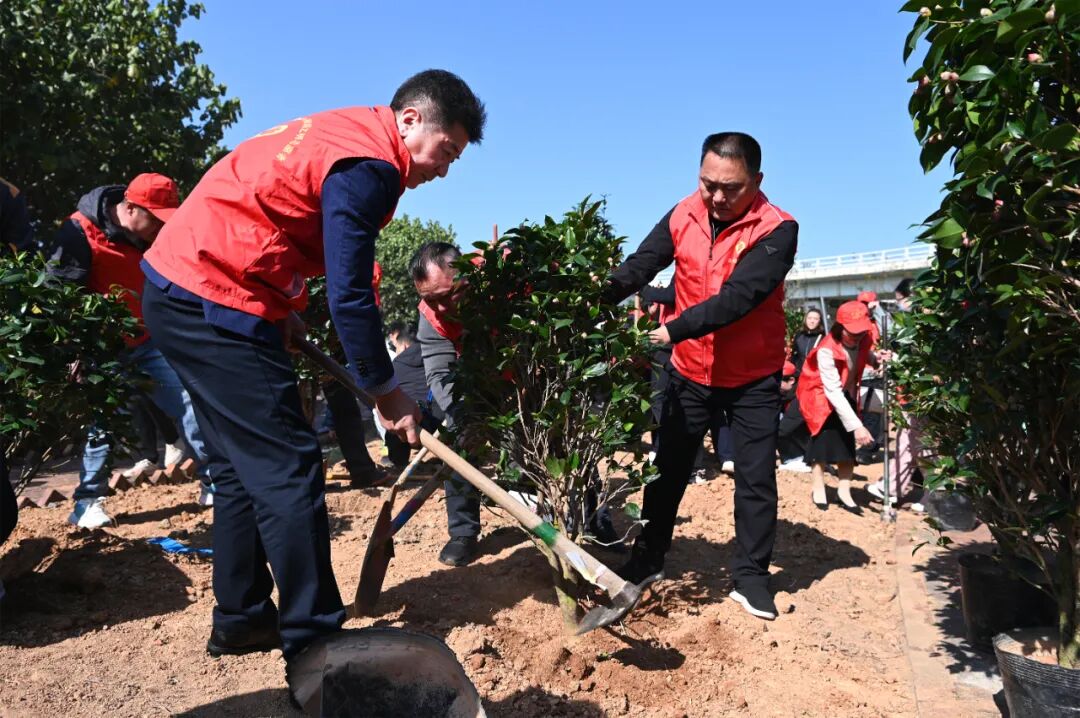 在植树现场,青年志愿者们身着红色志愿者马甲分工协作,挖坑、扶苗、培土、浇水,配合默契,动作迅速,处处呈现热火朝天的繁忙景象。经过一番辛勤劳动,一棵棵茶花树迎风而立,为大地增添了一抹绿色,呈现出勃勃生机。