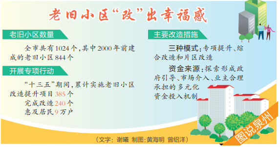 根据摸底,泉州市共有老旧小区1024个,其中2000年前建成的844个。2017年起,泉州市启动实施老旧小区改造专项行动,推动老旧小区配套设施逐步完善、环境面貌大幅改善、社区治理长足提升。针对不同类型的老旧小区,通过专项提升、综合改造和片区改造三种模式,提升小区颜值和品质。改造资金来源,则按照“谁受益,谁出资”原则,通过政府补助、业主自筹、社会资本或专业机构投入等方式,探索形成政府引导、市场介入、业主合理承担的多元化资金投入机制。